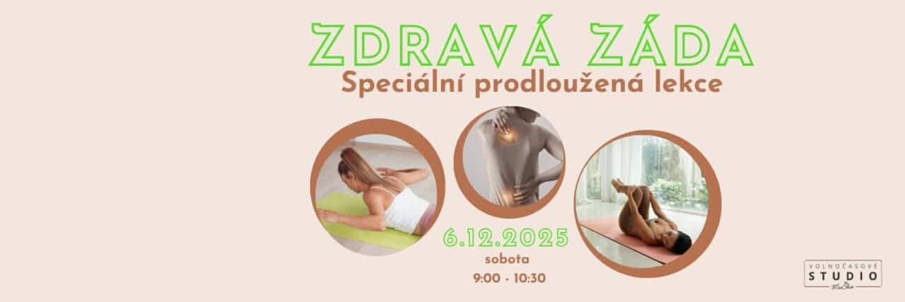 Zdravá záda Speciální prodloužená lekce Speciální prodloužená lekce Zdravých zad je určena pro všechny, kdo si chce v předvánočním čase uděla čas pro sebe a udělat něco pro své zdraví. Sobota 6.12.2025 9:00- 10:30 Čeká nás dechové cvičení, aktivace plosek, mobilizace páteře, protažení zkrácených svalů, posilování oslabených svalů, stimulace svalů pánevního dna a v závěru...